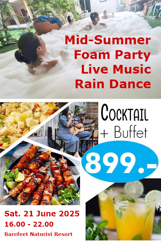 Barefeet Naturist Resort is arranging a Foam Party with Buffet, Cocktails, Live Music and Rain Dance on Saturday 21 June 2025. The shortest night of the year!